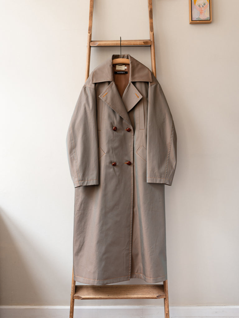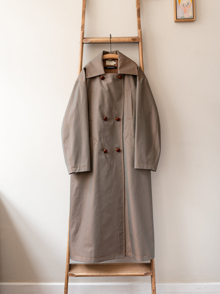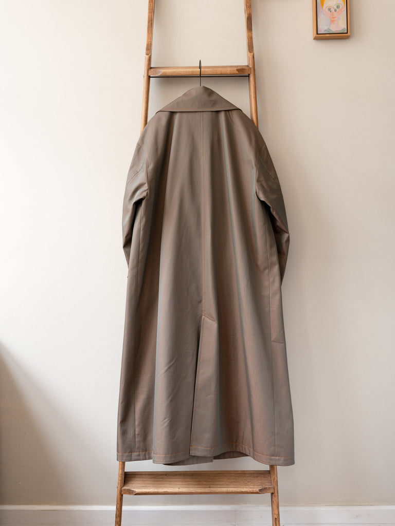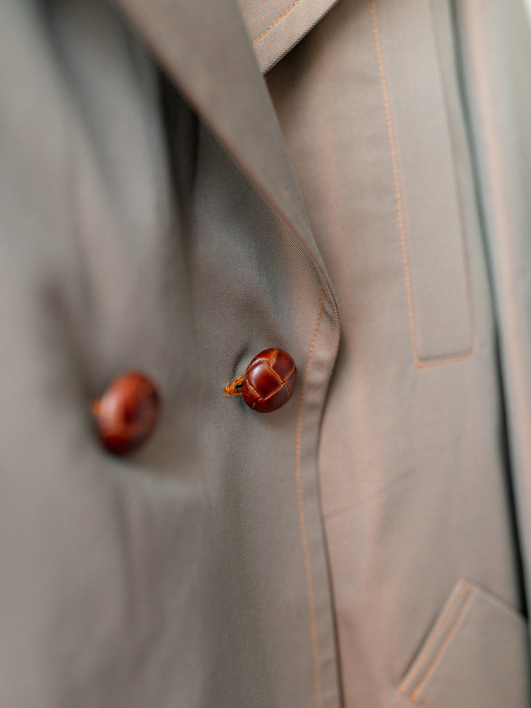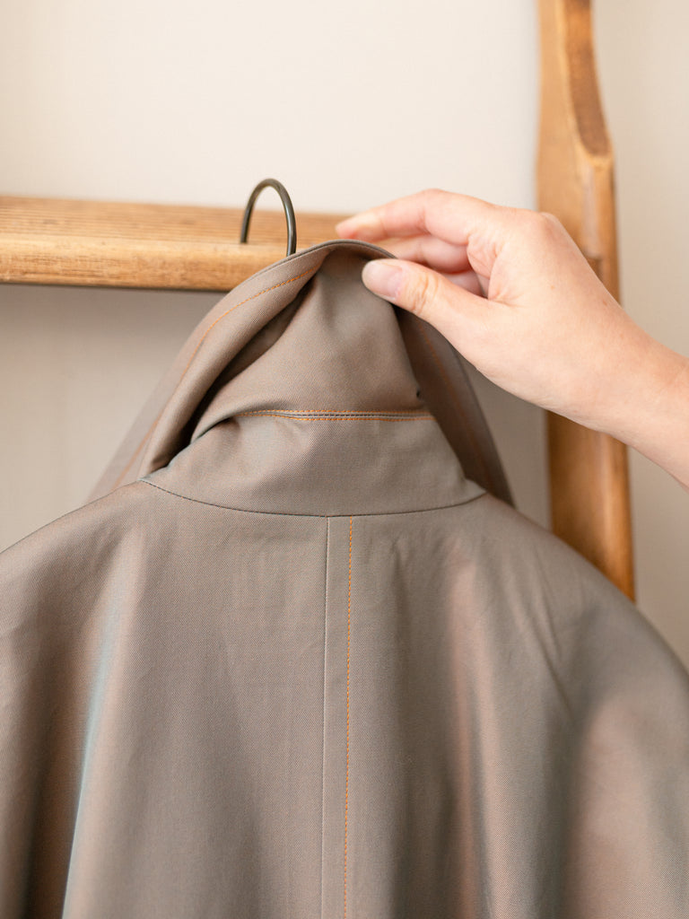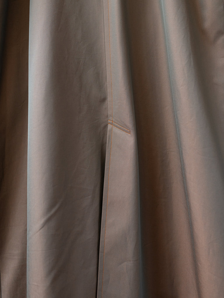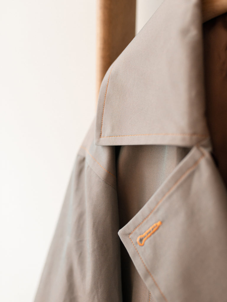 Slightly iridescent khaki colour fabric with contrast orange top-stitch