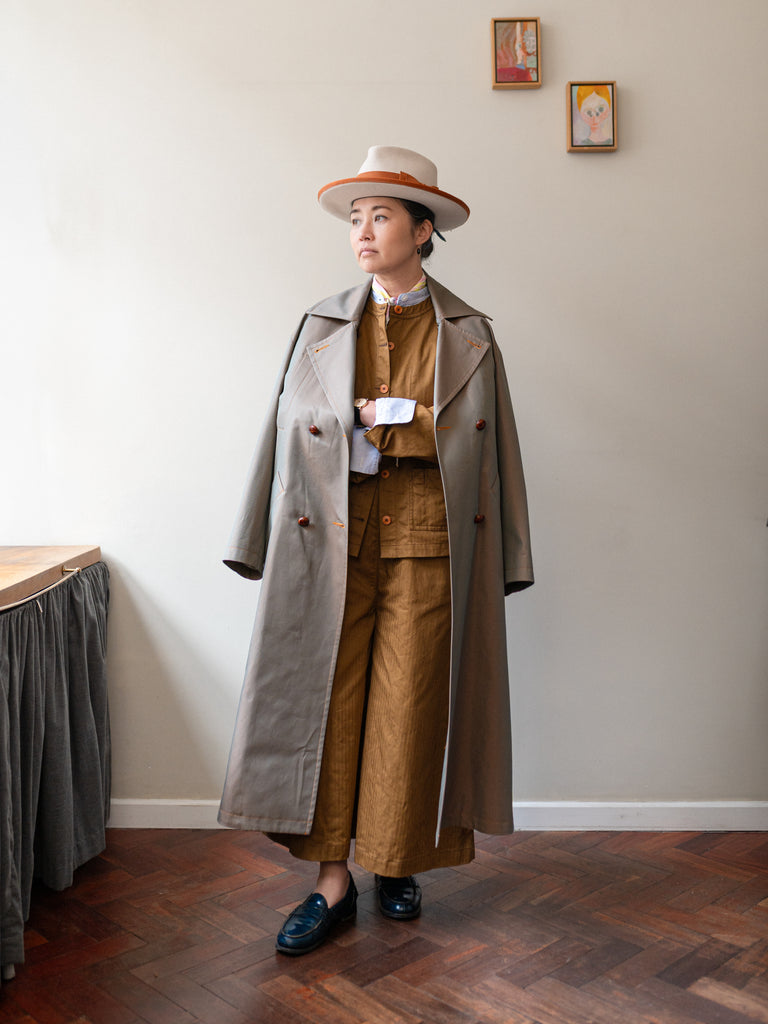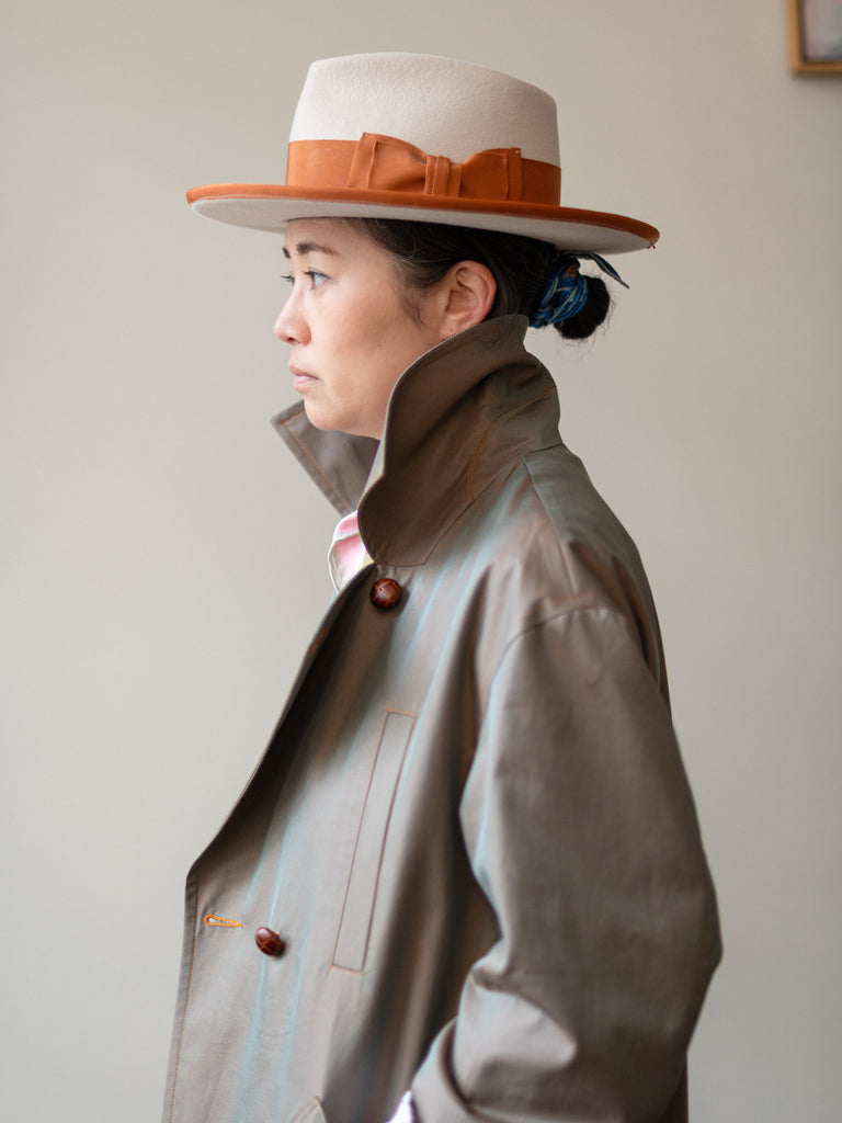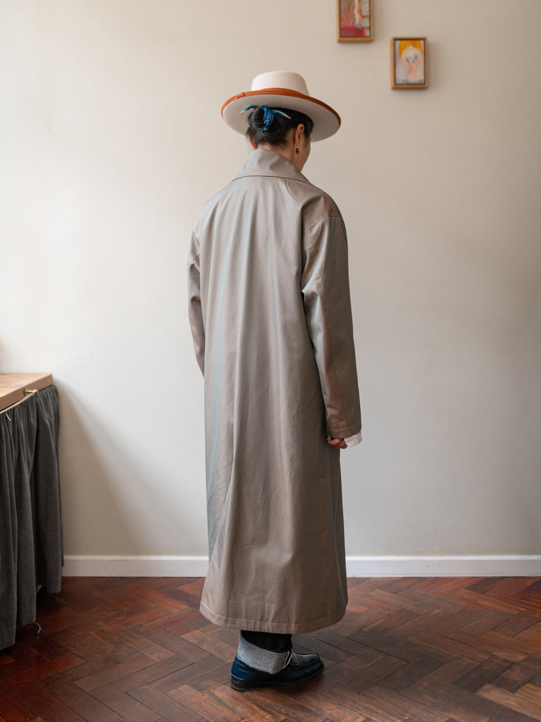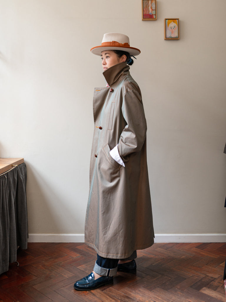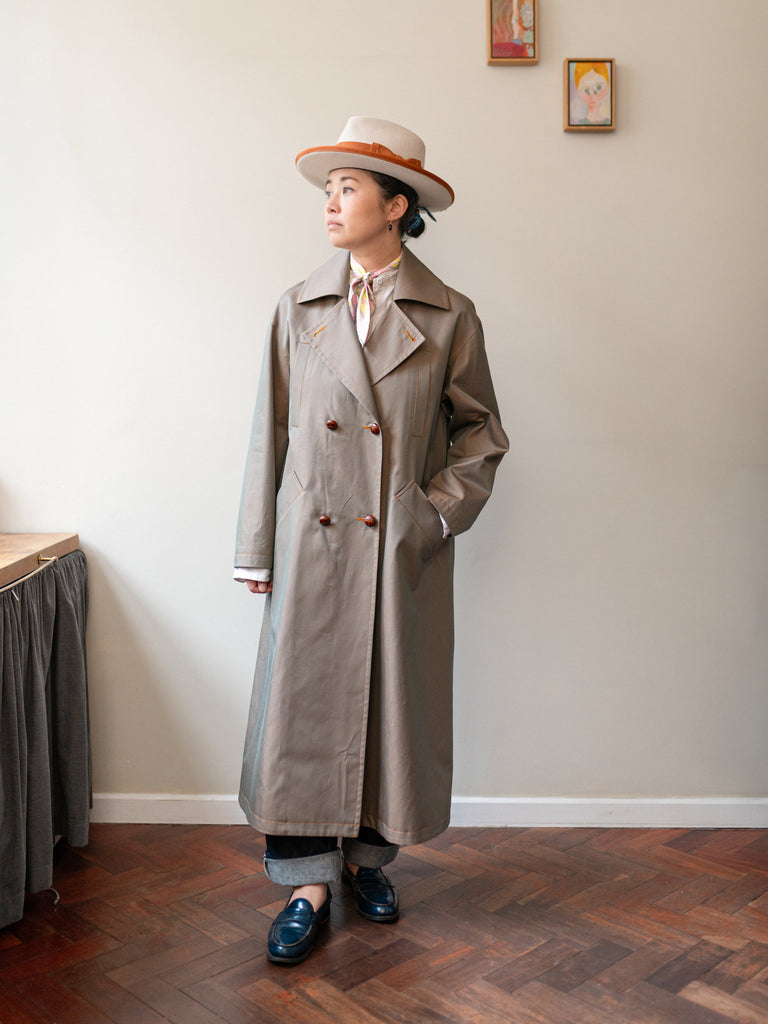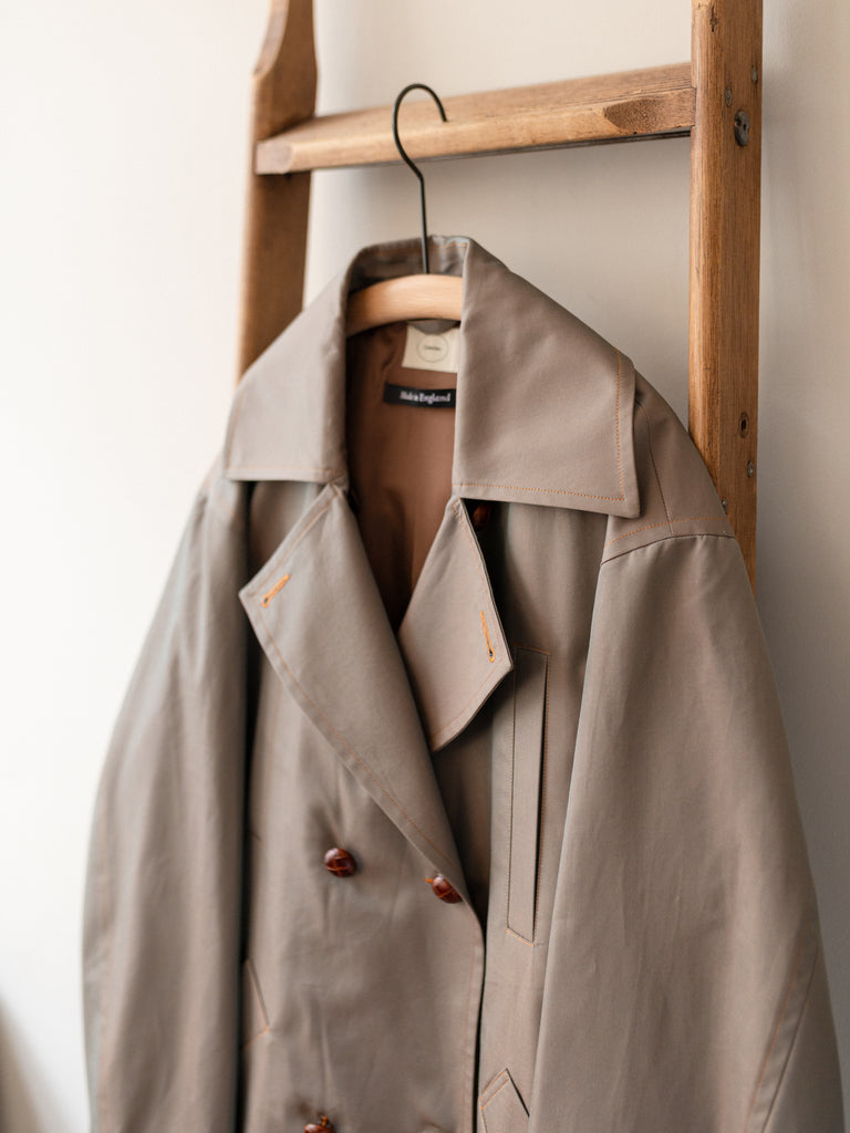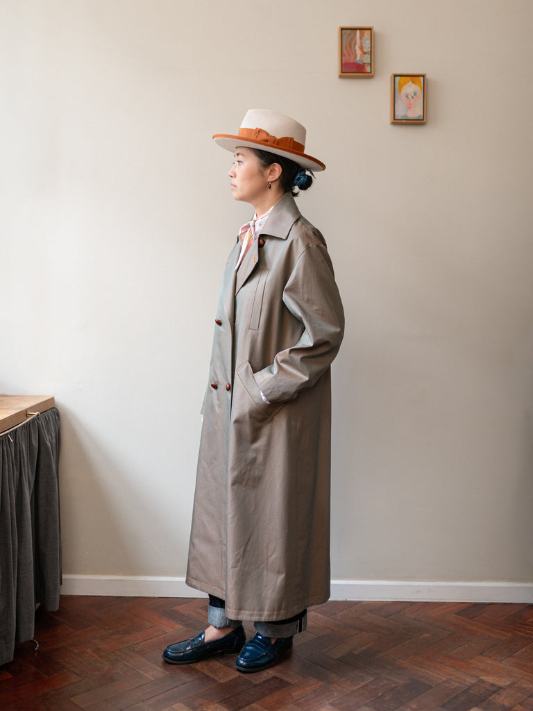Slightly iridescent khaki colour fabric with contrast orange top-stitch