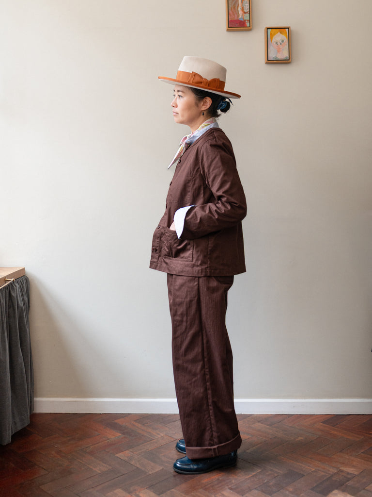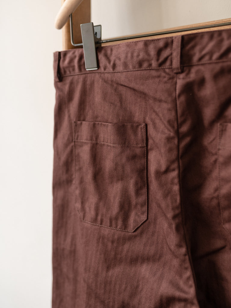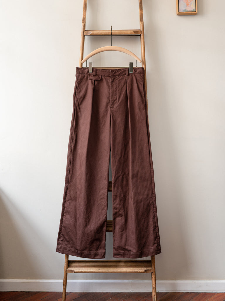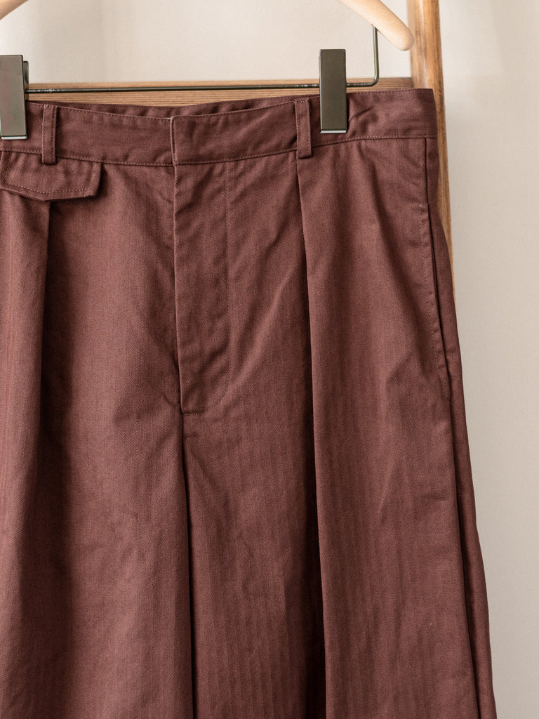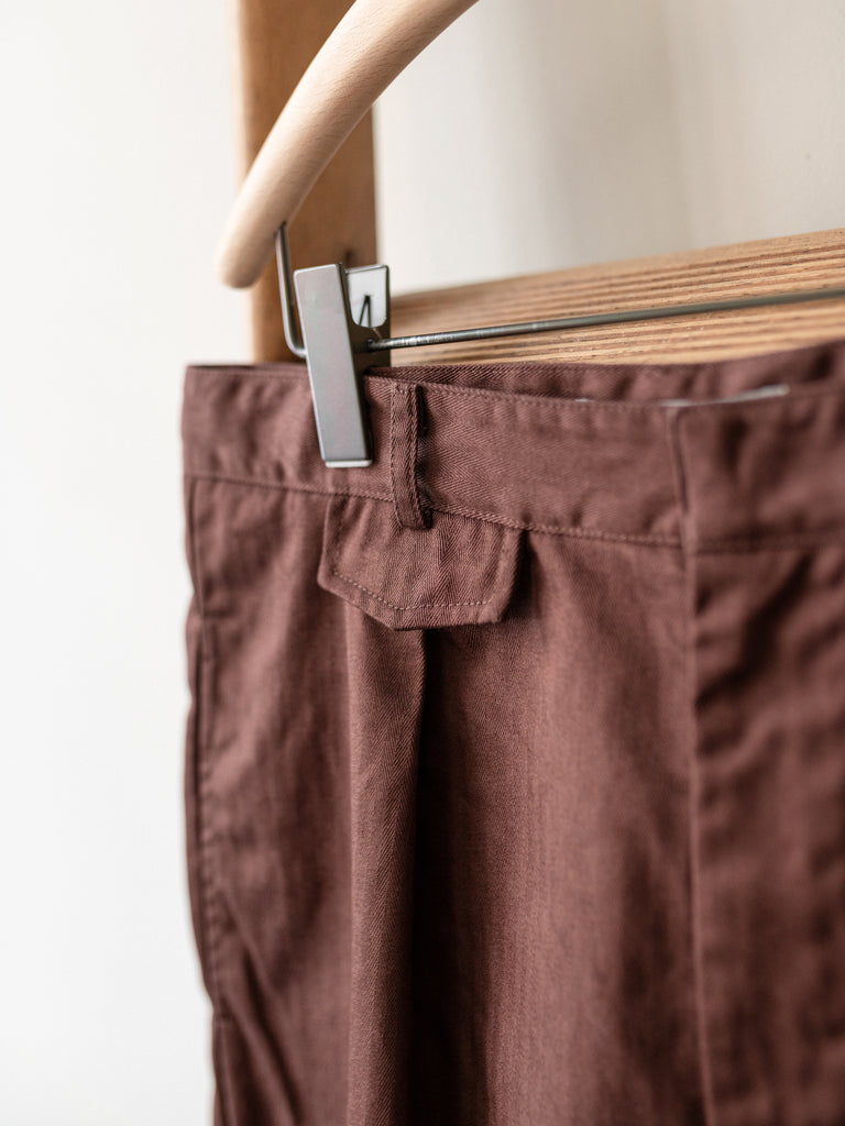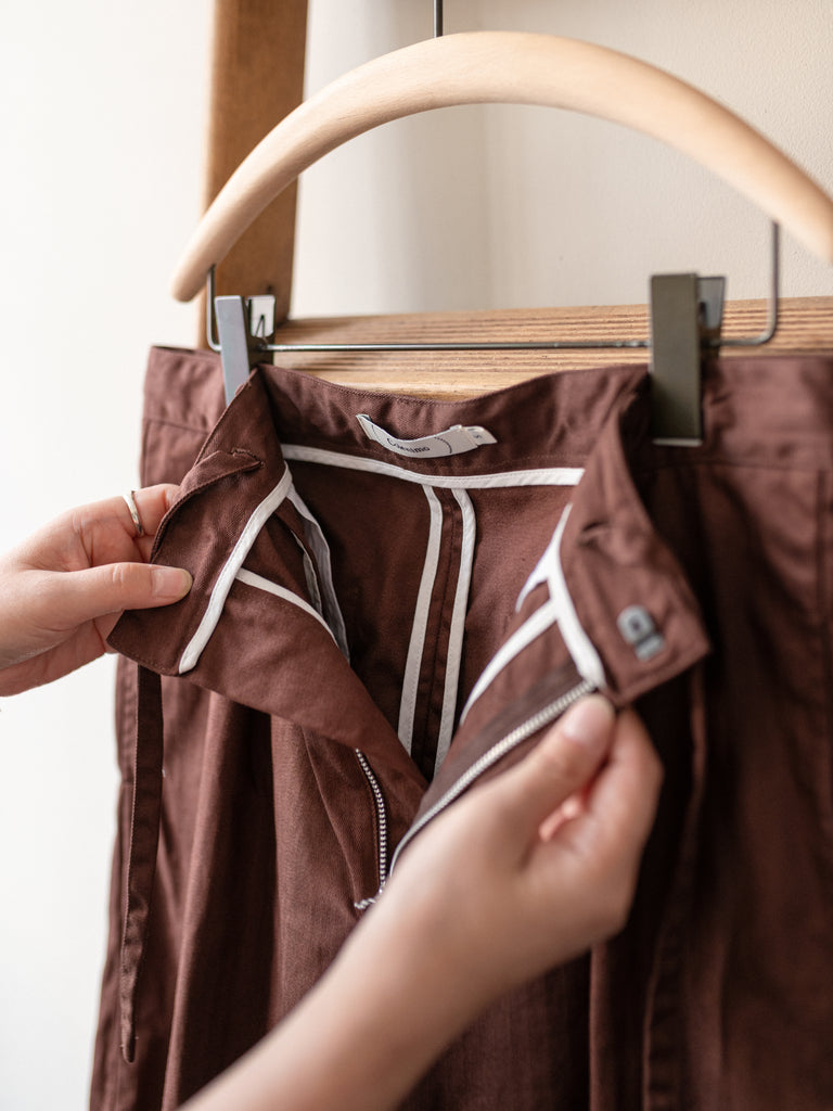Flap coin pocket on front, two tuck pleats, five belt loops, zip fly