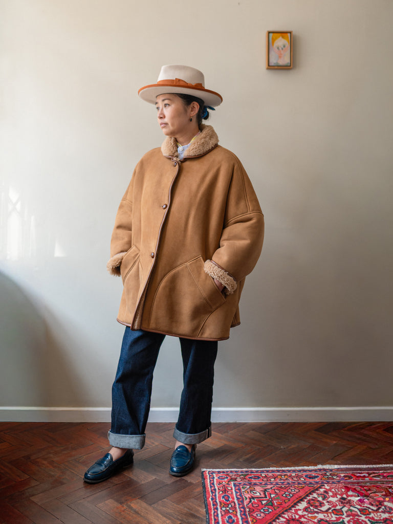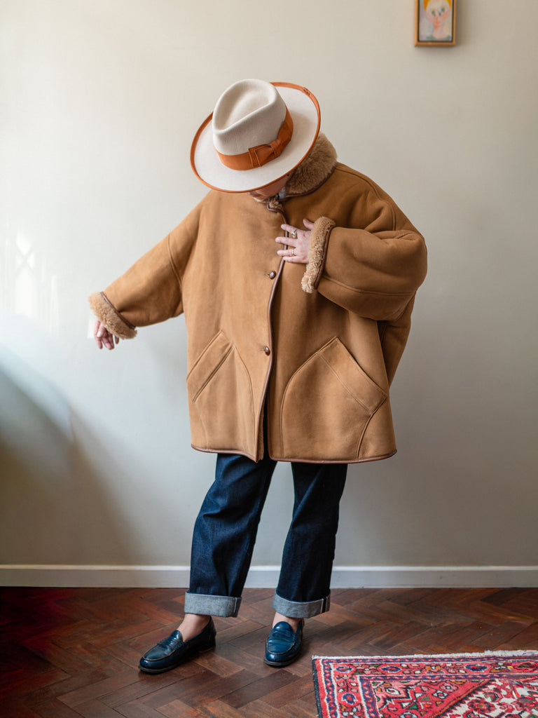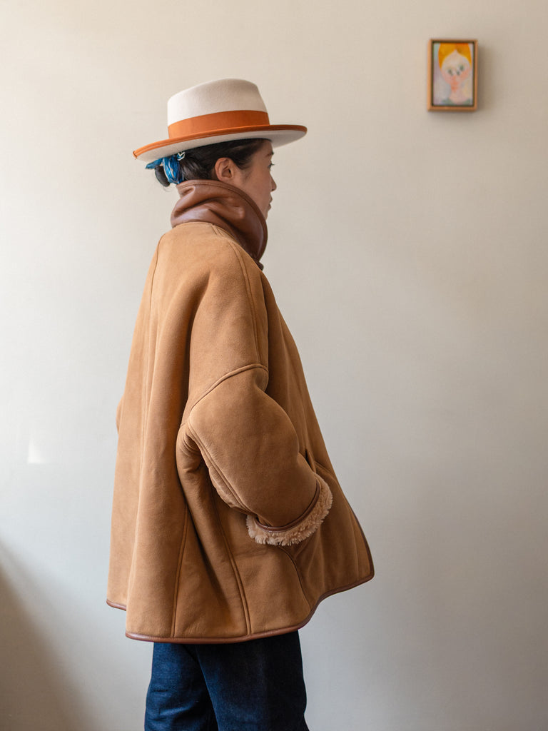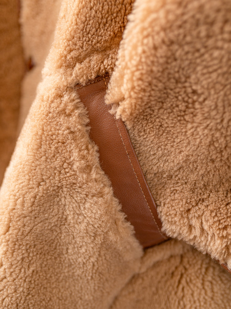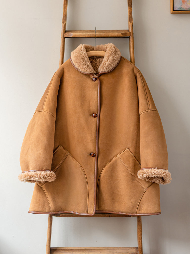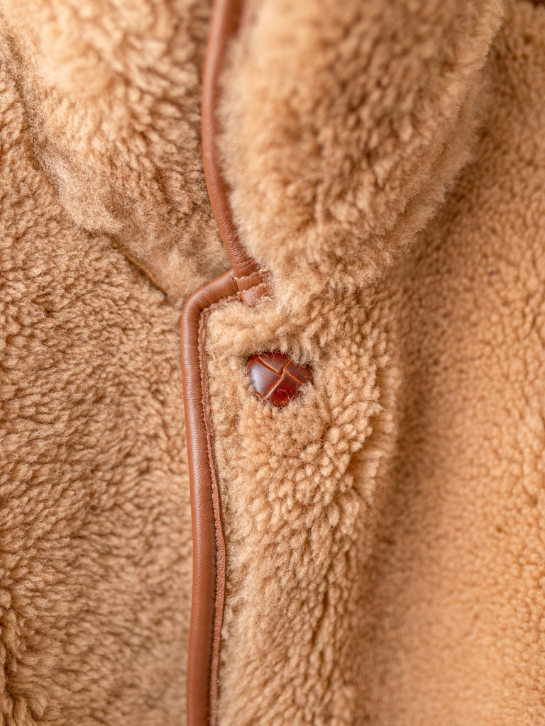Suede merino sheepskin poncho-coat with real leather buttons.