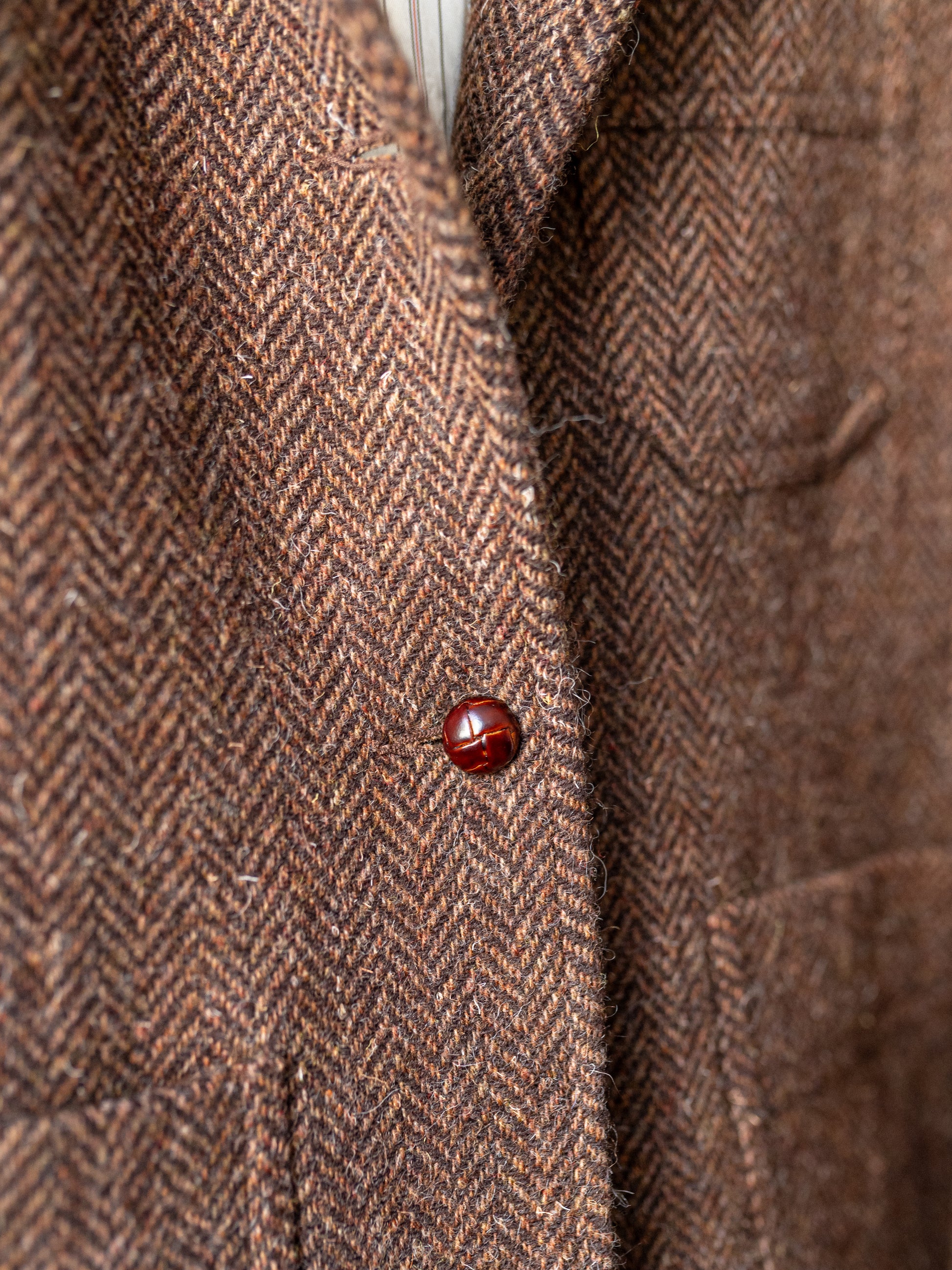 The tweed uses 100% British wools – spun to a traditional recipe which retains the "kempy" fibre and gives the cloth an unmistakable character.