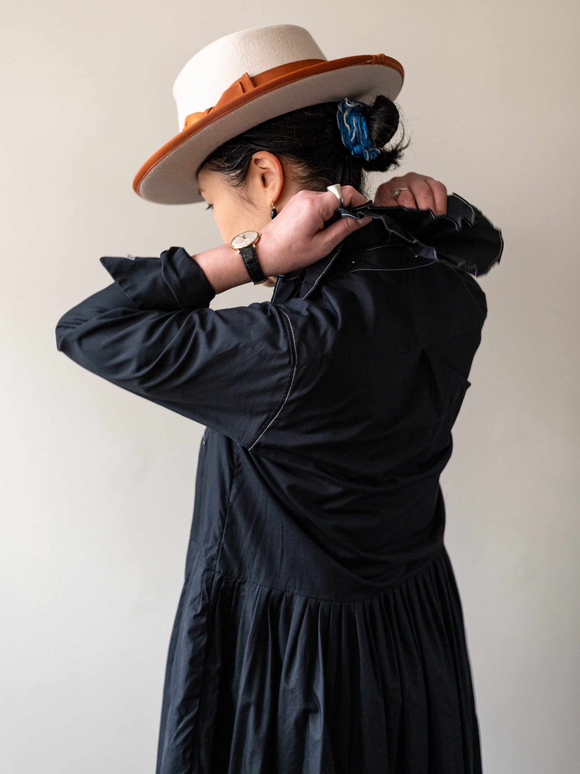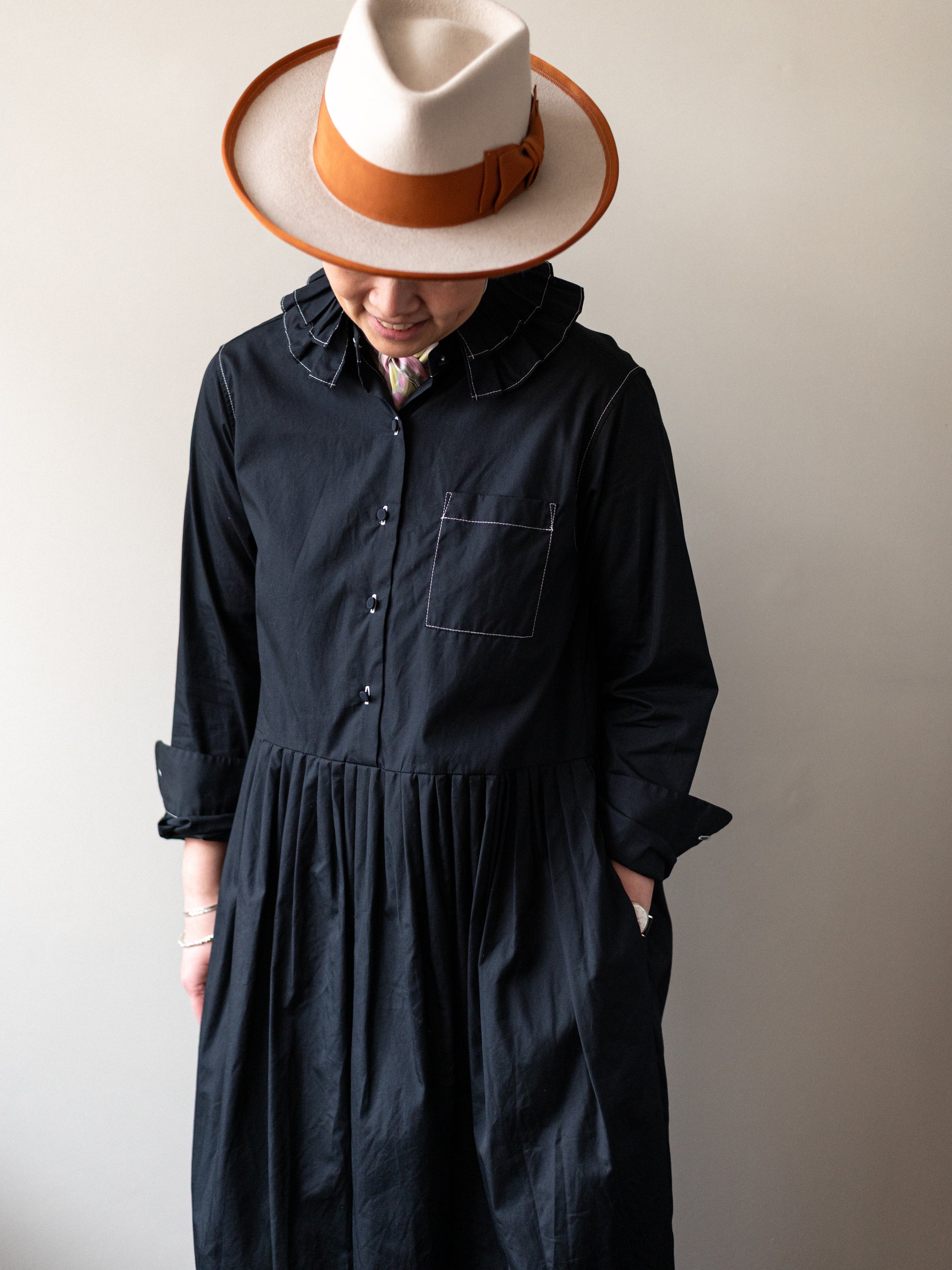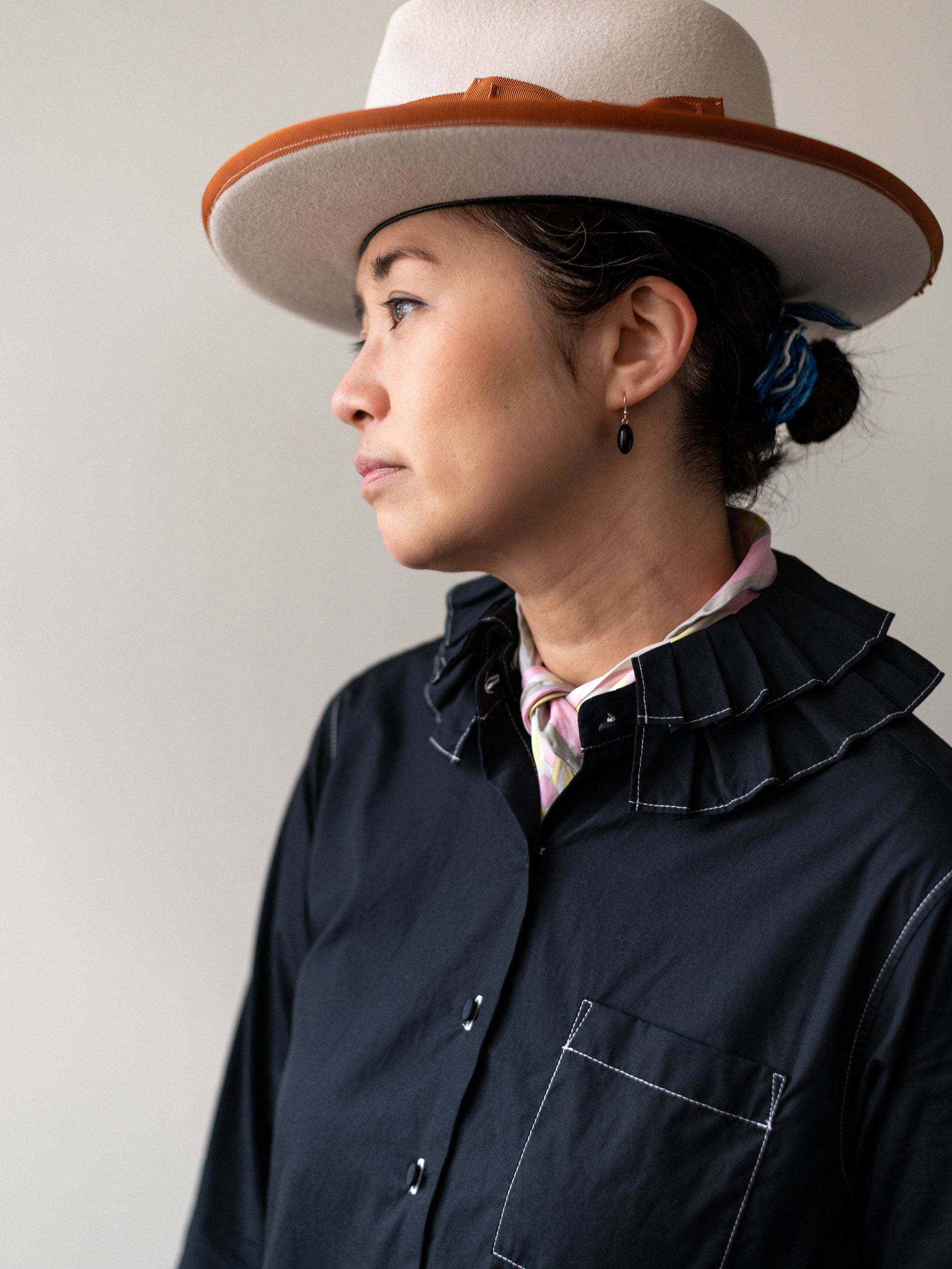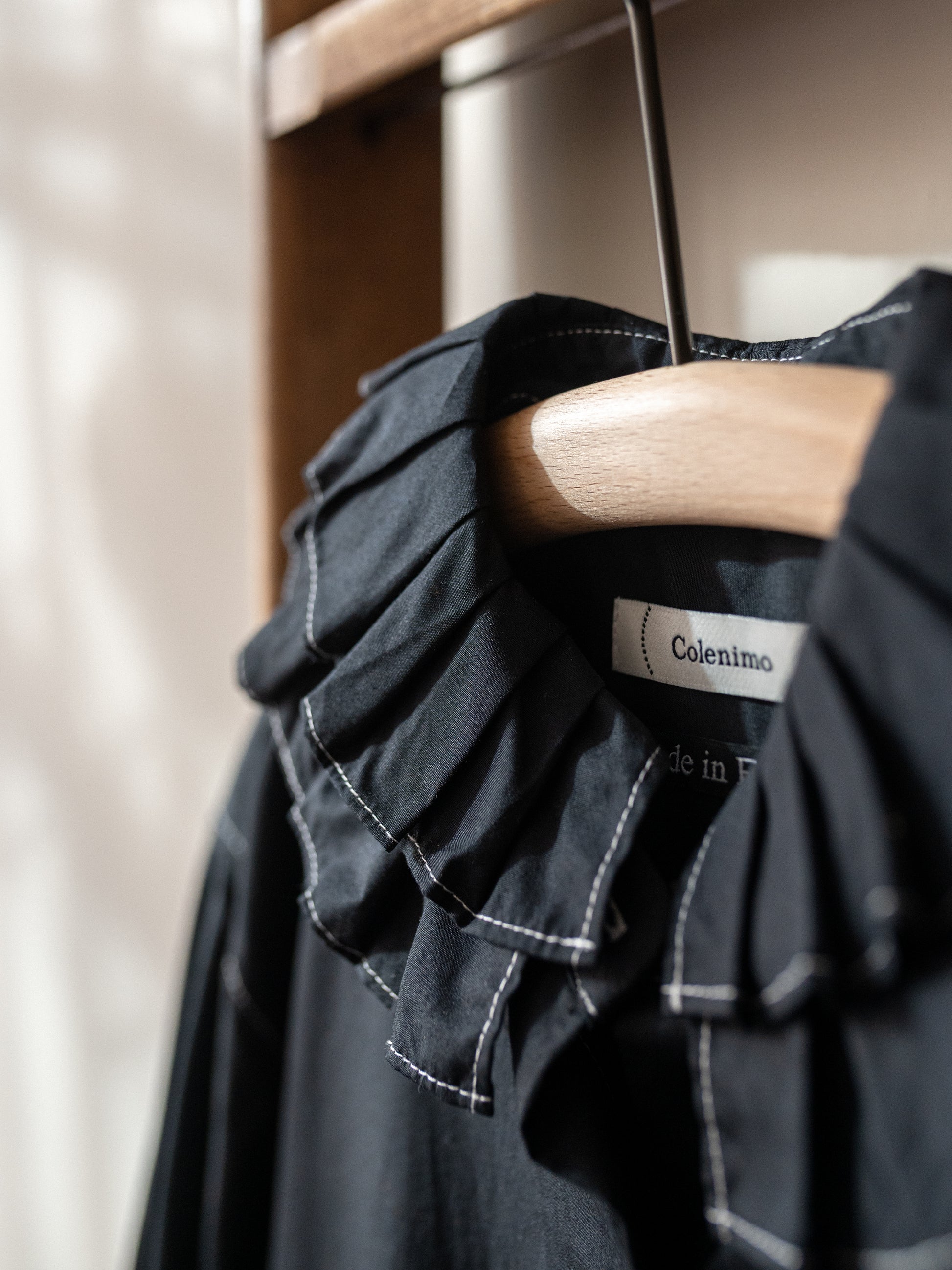 Detachable double ruffle collar with covered buttons on the front and cuffs