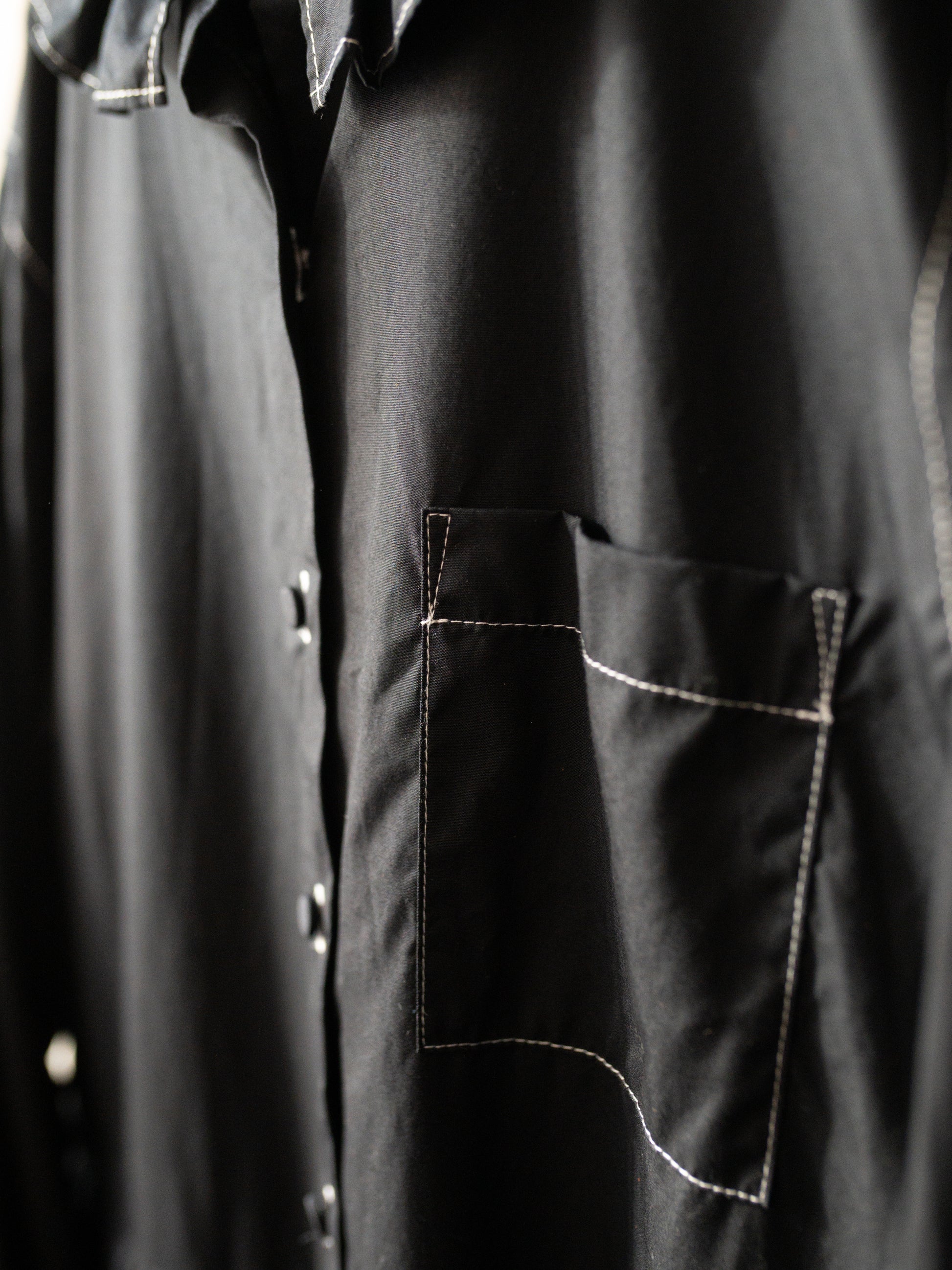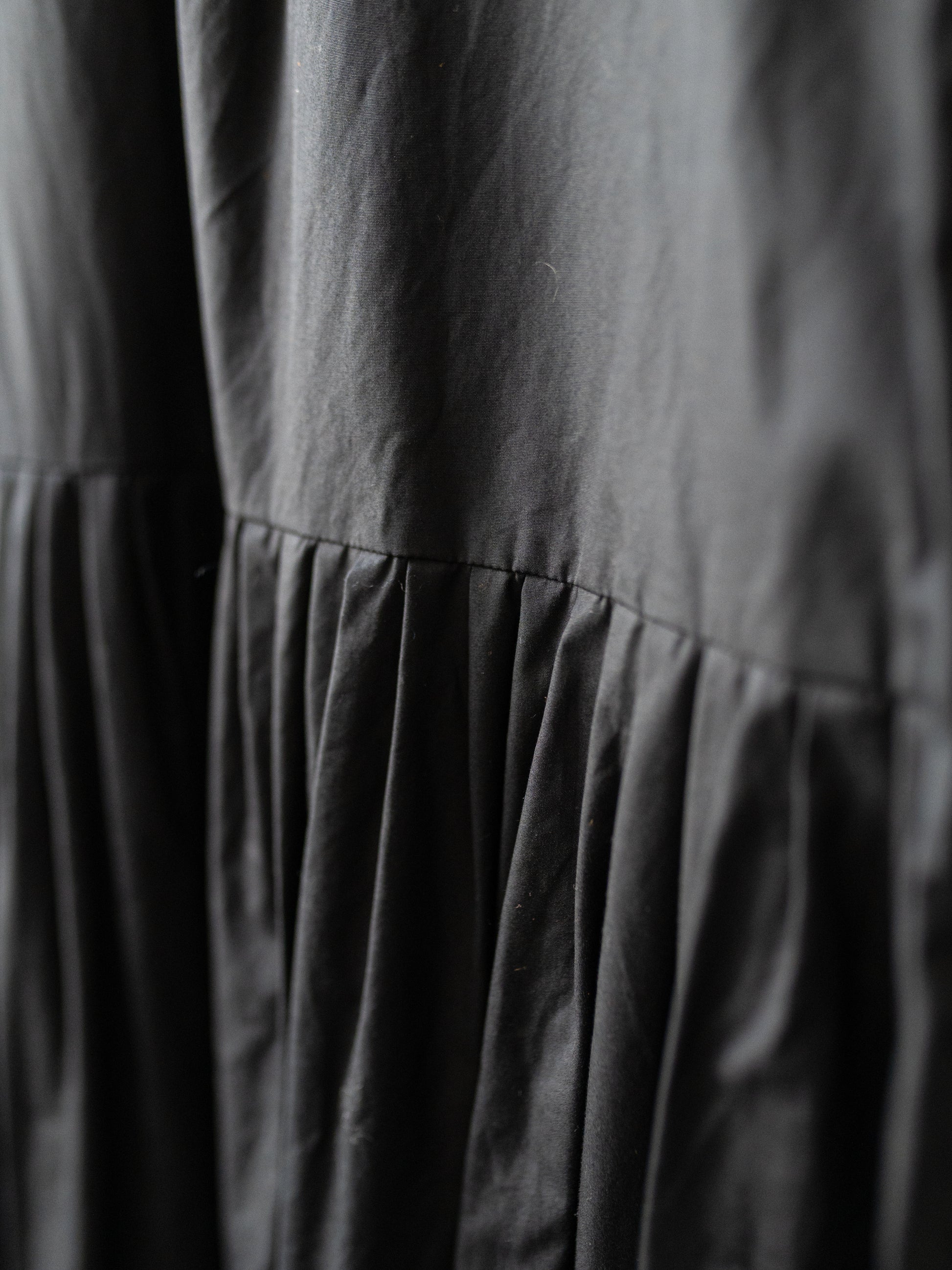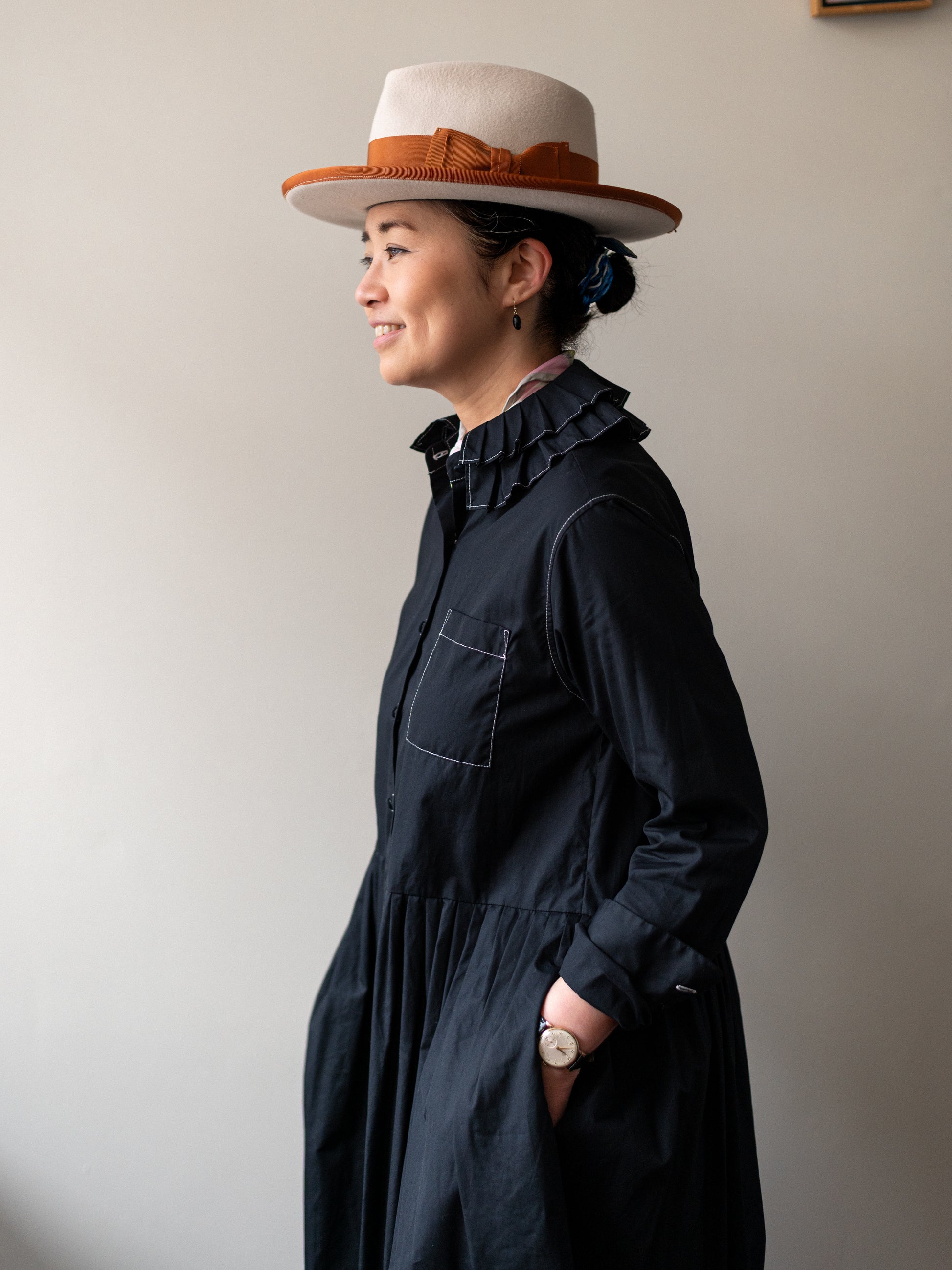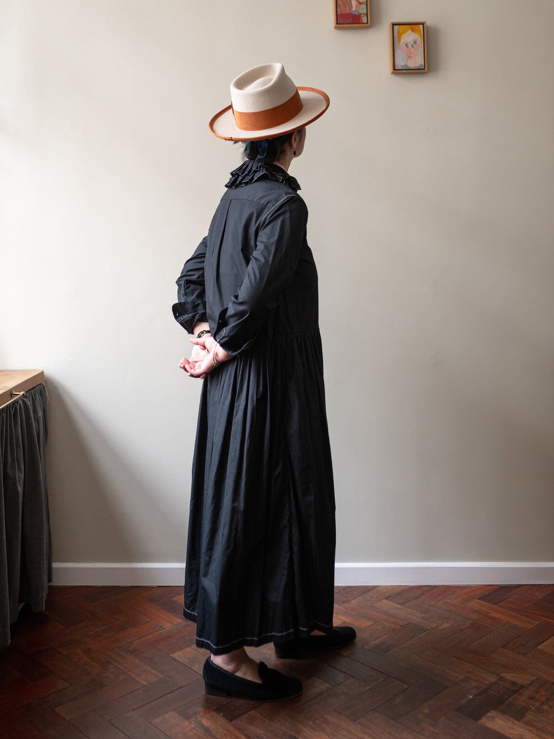 Detachable double ruffle collar with covered buttons on the front and cuffs