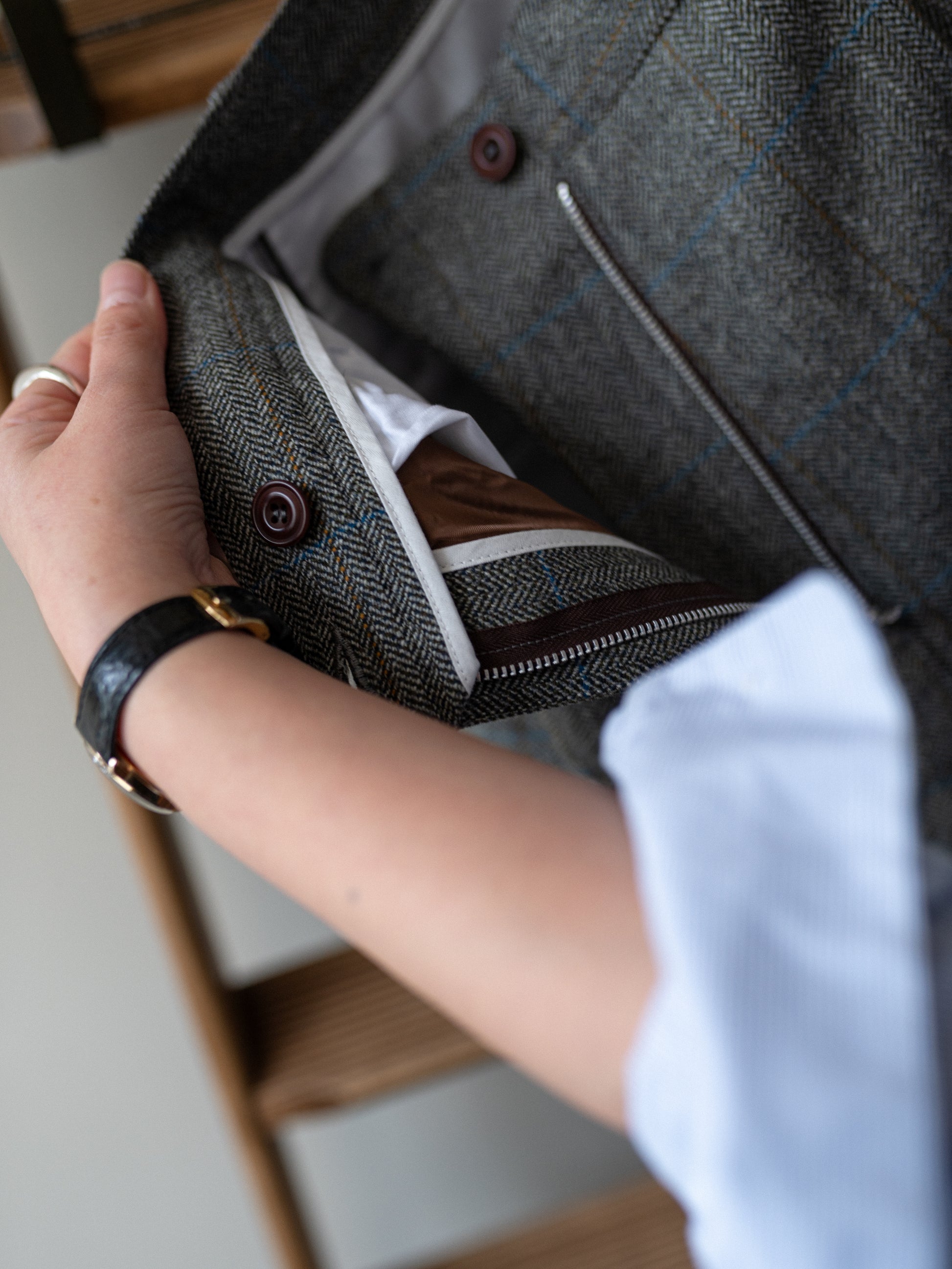 100% wool tweed, made from worsted, merino and fine cheviot woollen spun yarns – woven at a small family owned Scottish mill